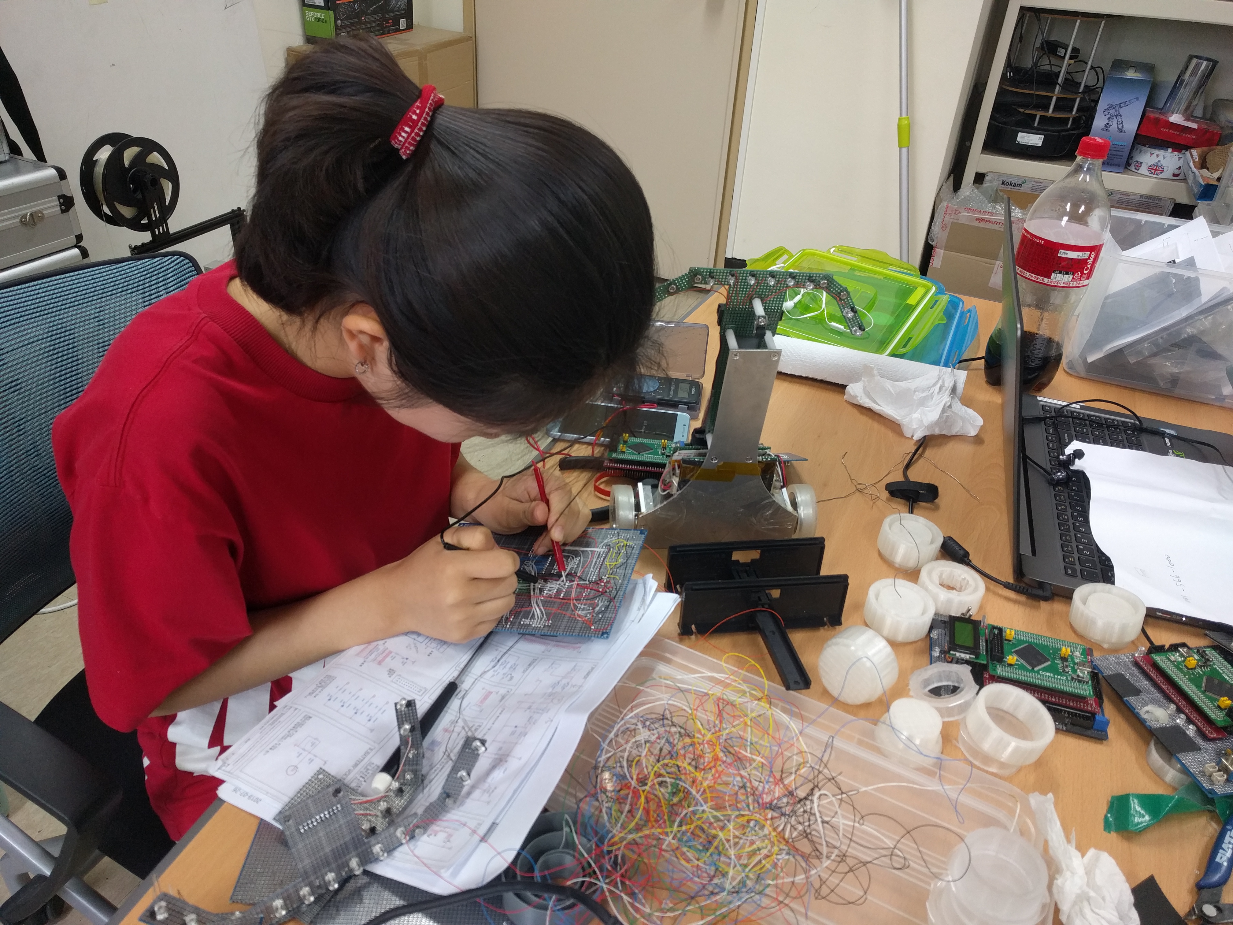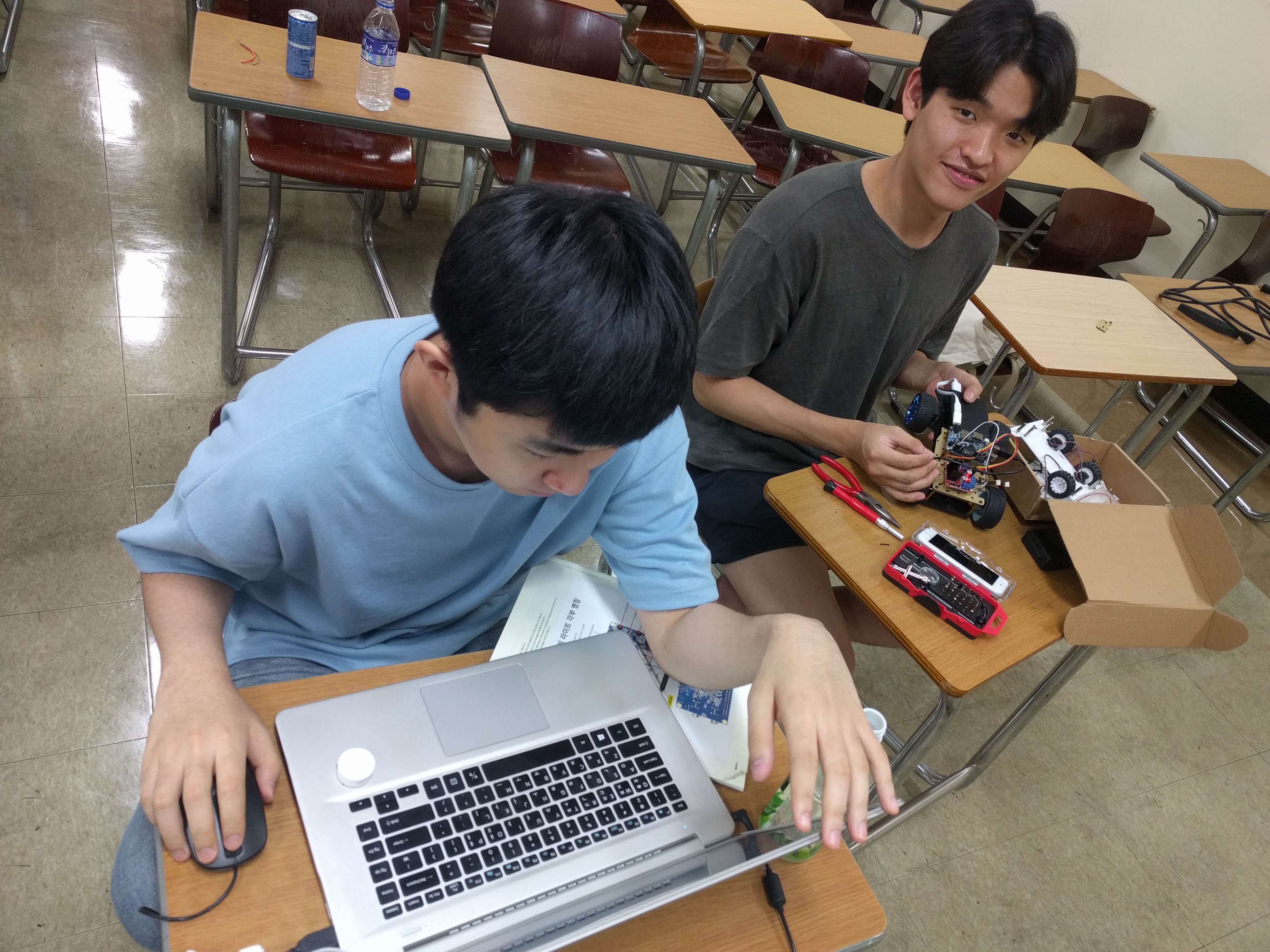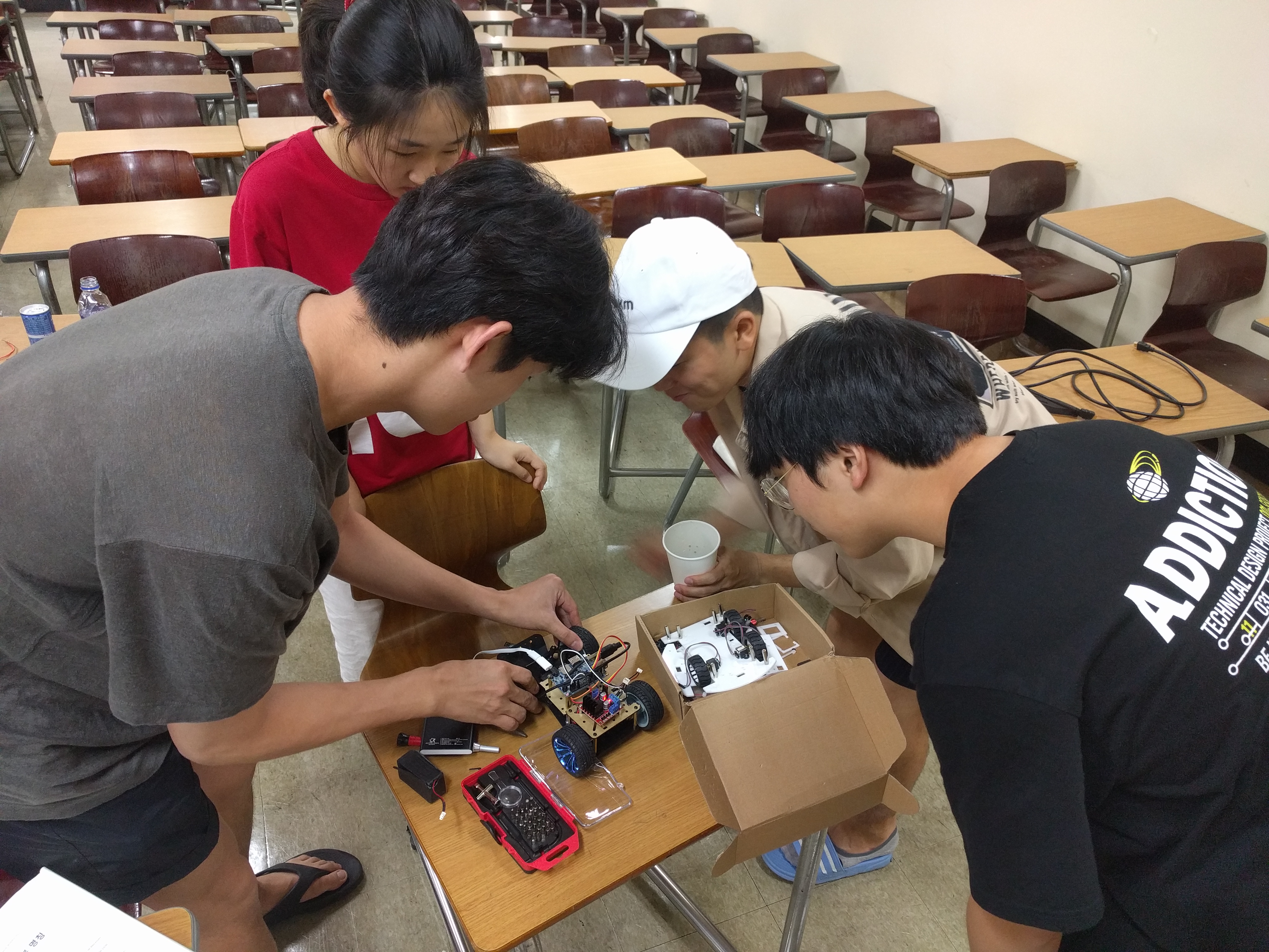 우리 학교랑 가까운 한국기술교육대 로봇동아리에서도 라인트레이서 로봇을 새로 만들기 시작했습니다. 아직 완성은 못 했지만 구경하러 왔대요. 우리 동아리랑 자주 모이게 될 것 같아요.