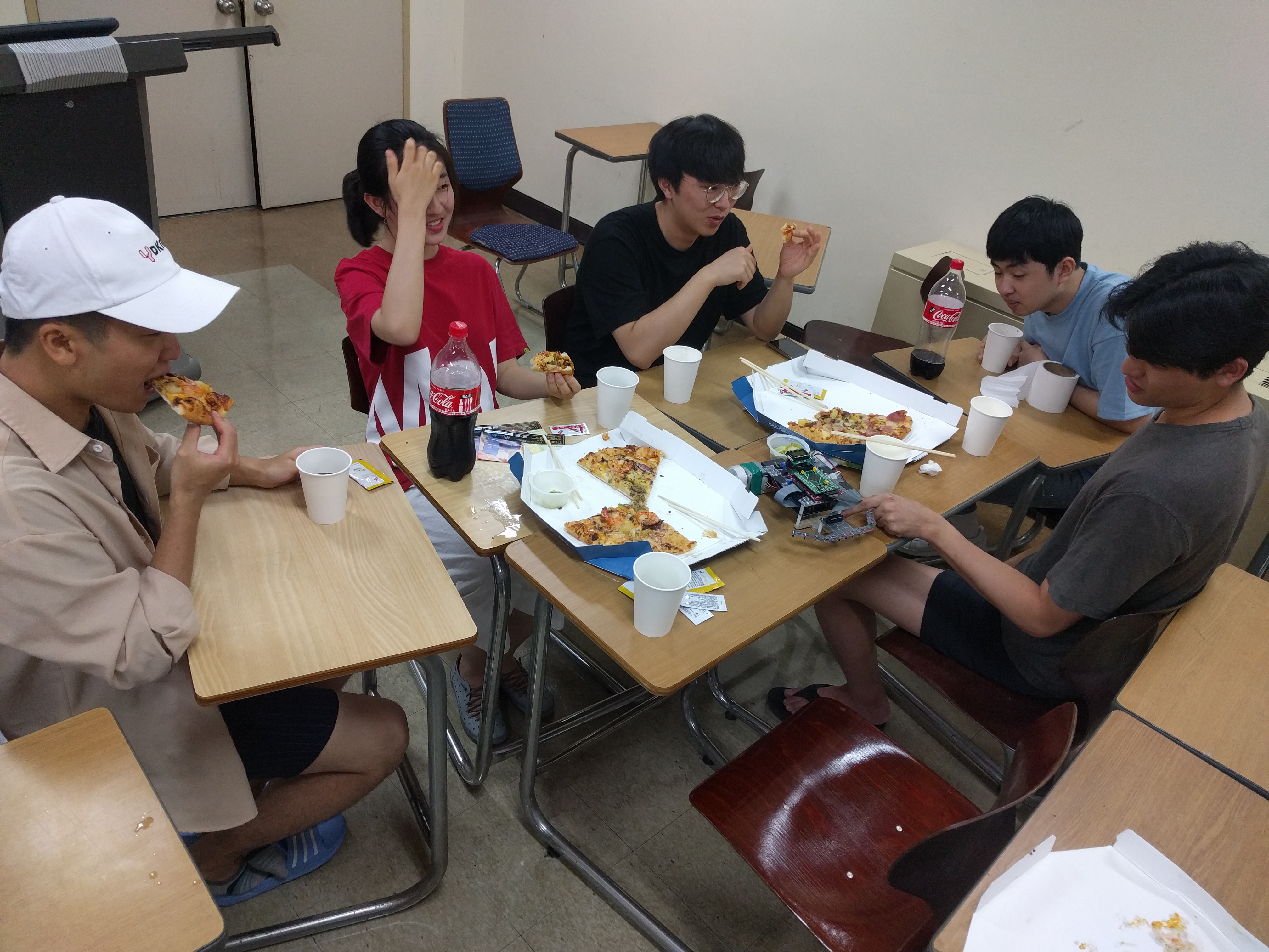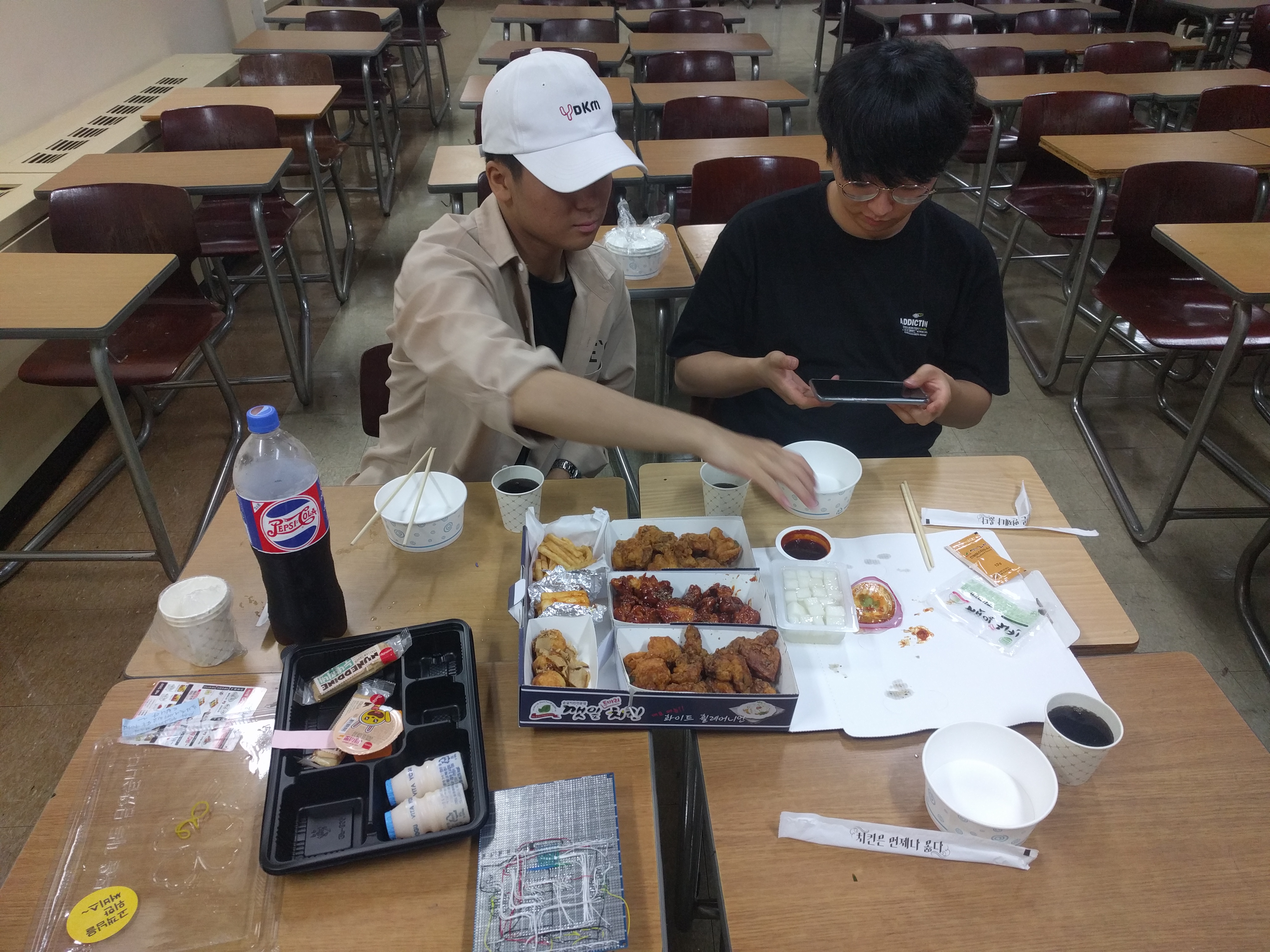 8월16일 야식입니다. 대회가 임박해서 밤샘 준비 중입니다. 먹으면서도 회로기판을 들여다봐야해요.